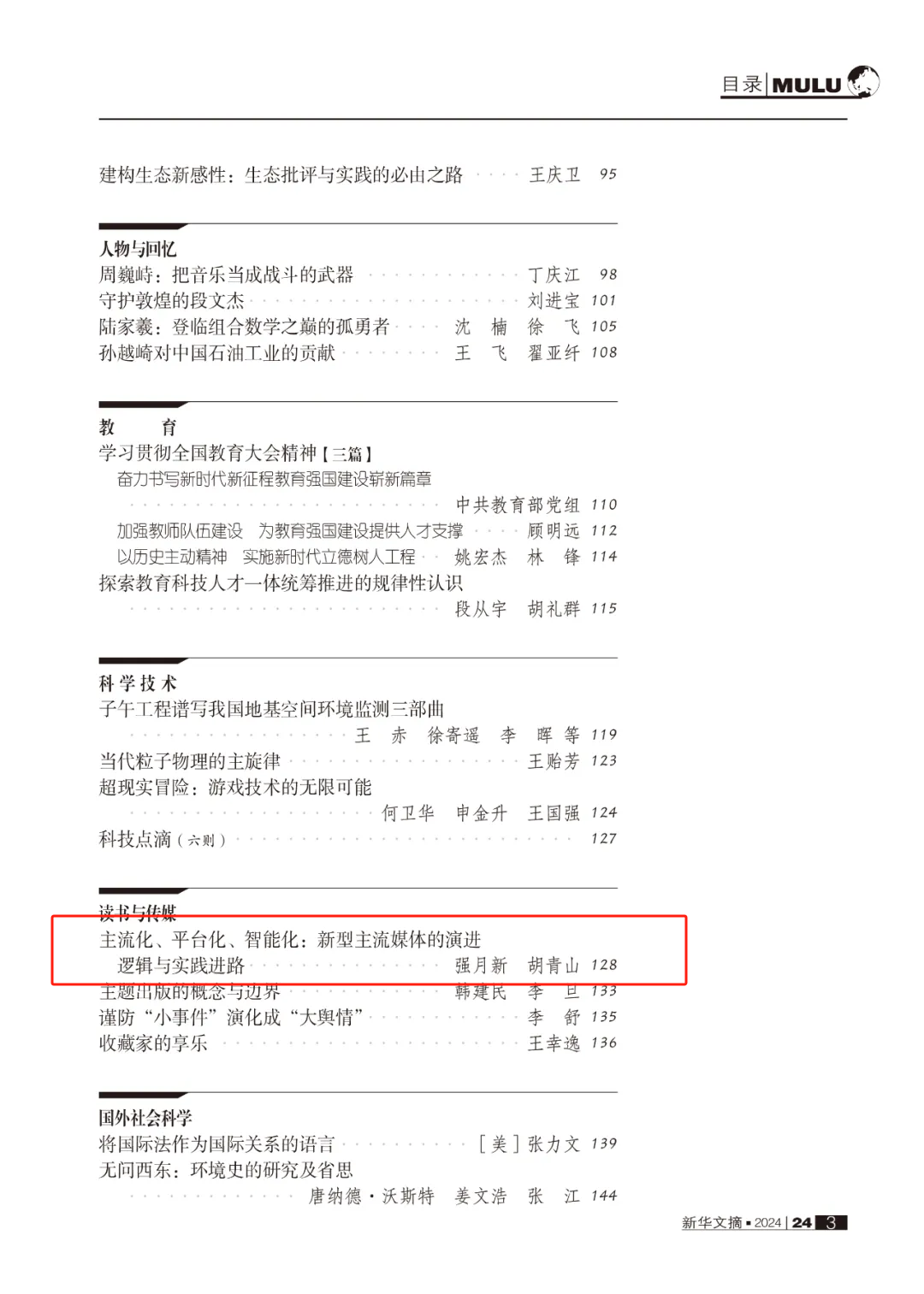 《新华文摘》2024年第24期“读书与传媒”专栏全文转载我院强月新教授与其博士生胡青山合著的文章《主流化、平台化、智能化:新型主流媒体的演进逻辑与实践进路》。